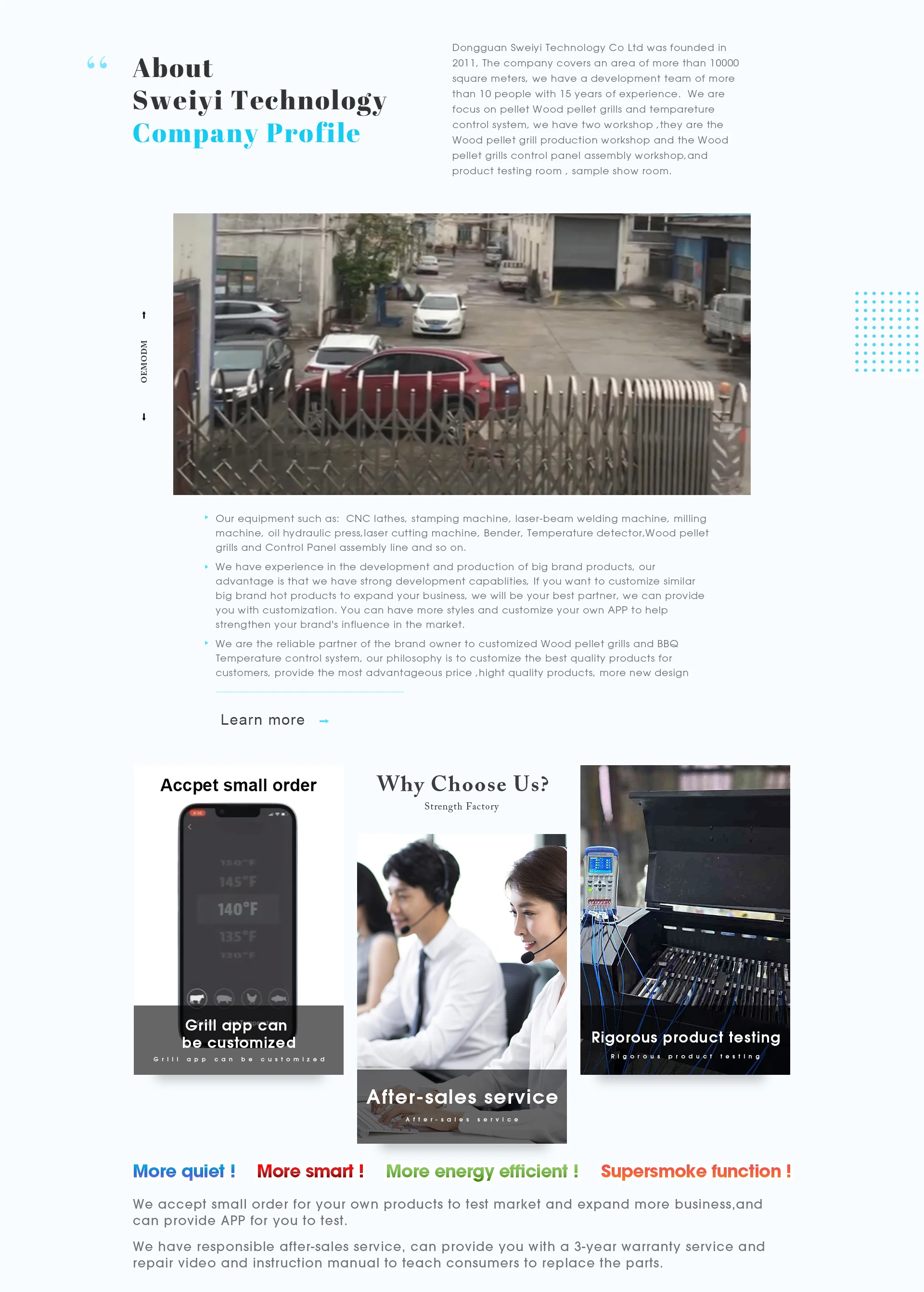 Dongguan Sweiyi Technology Co., Ltd. Productos principales:Parrilla de pellets y ahumador de pellets Conjunto de tolva, parrilla de carbón, accesorios eléctricos para humo y barbacoa, asador, termómetros para carne y controlador de temperatura para barbacoa